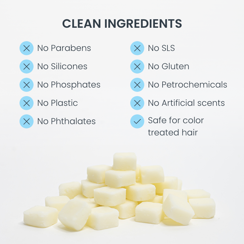 • Shampoo: Caprylic/Capric Triglyceride, Sodium Lauryl Sulfoacetate, Sodium Cocoyl Isethionate, Sodium Bicarbonate, Citric Acid, Behentrimonium Methosulfate, Cetyl Alcohol, Butylene Glycol, Oryza Sativa (Rice) Starch, Argania Spinosa Kernel Oil, Coco-Caprylate/Caprate, Tocopherol, Gluconolactone, Parfum.