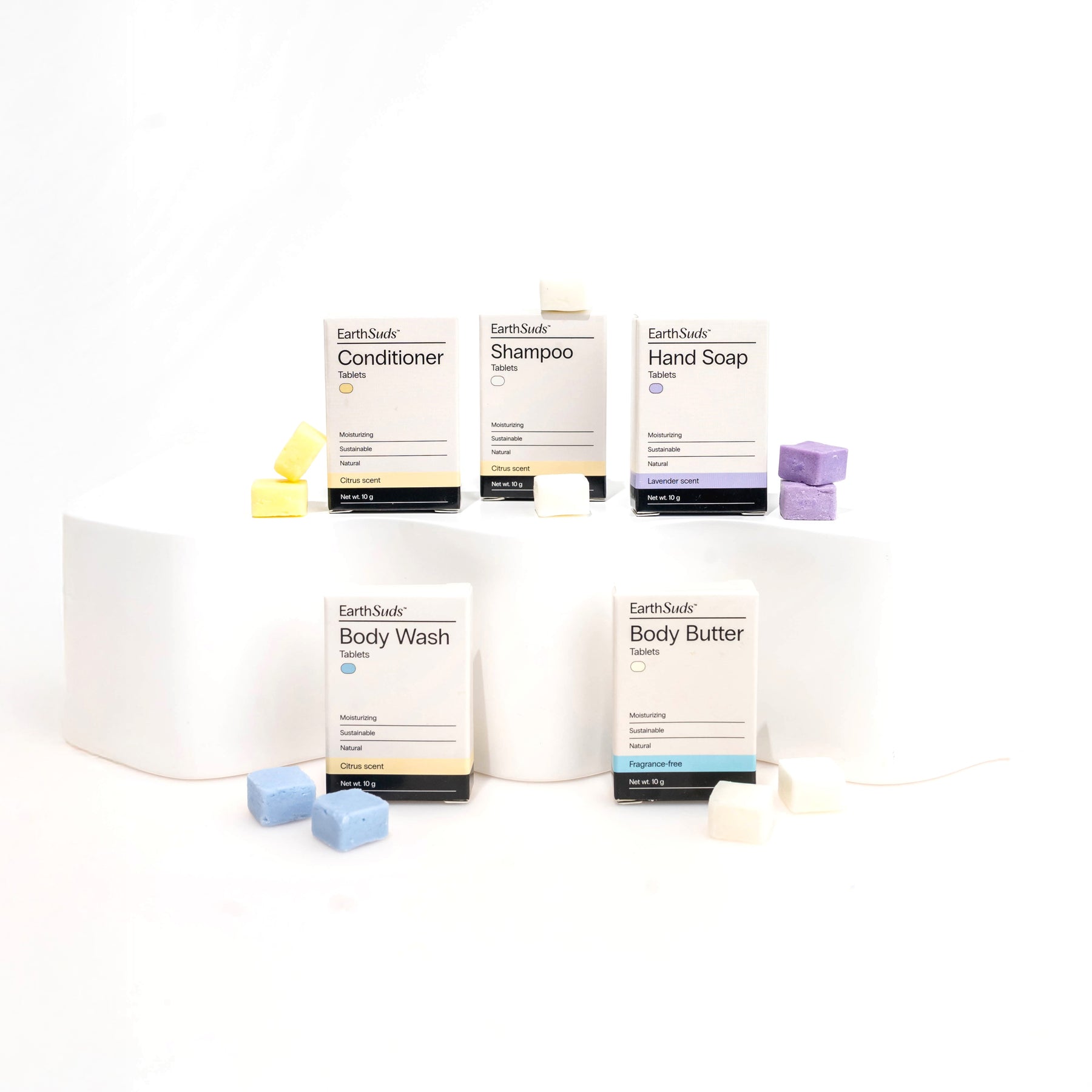 Shampoo, no bottle. EarthSuds are dissolvable tablets of shampoo, conditioner, body wash, hand soap, and body butter. This Sampler Kit lets you try all products! It includes 10 Mini packs (2x shampoo, 2x conditioner, 2x body wash, 2x hand soap, 2x body butter) and each Mini has 2 tablets (20 tablets total). Particularly convenient for travellers and they make great gifts!